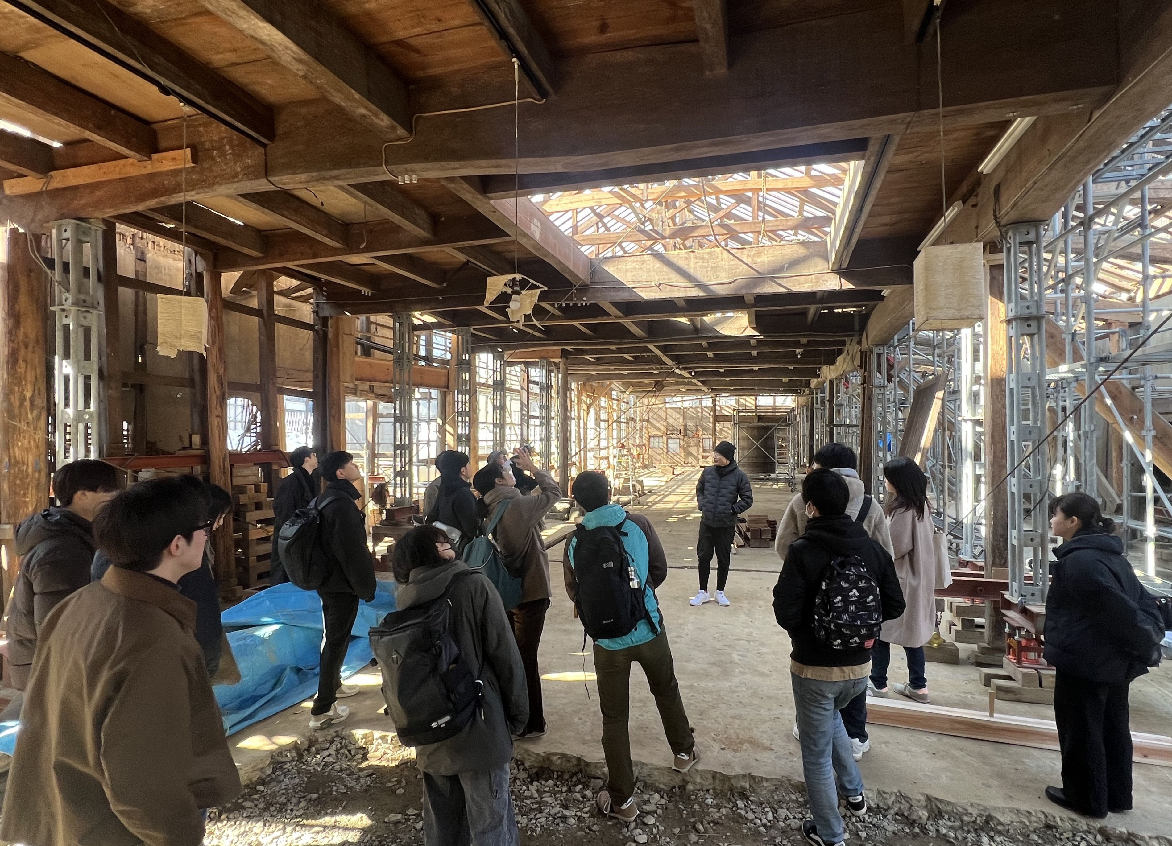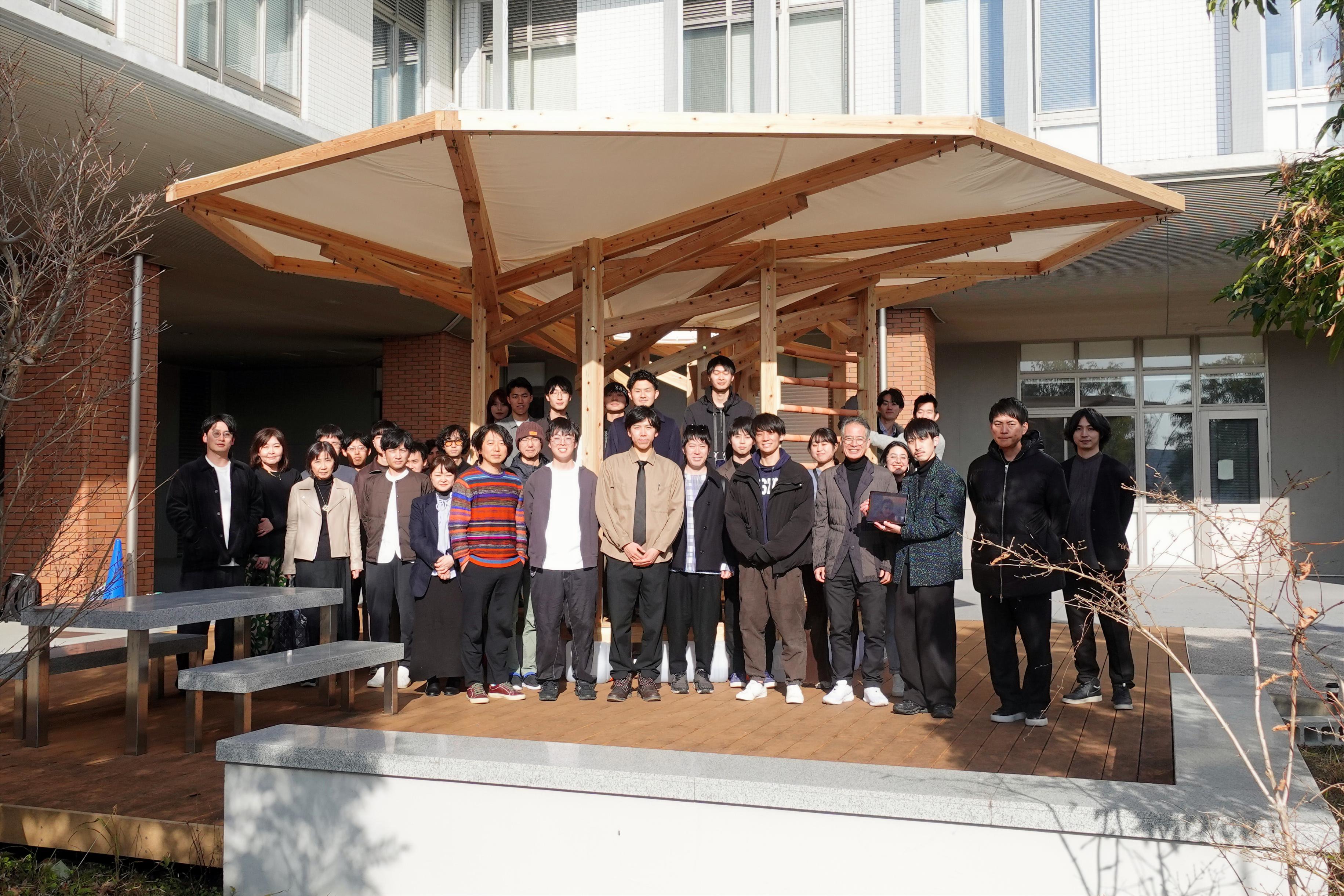 | 教育としてのスタジオでは、廃材のアップサイクルをテーマにしたパビリオンの設計と建設、また建築廃材のサーキュラーネットワークをデザインしました。 BeCAT応用プログラムには6名の学生が取り組み、「大径材を利用した木製仮囲い」、「建設残土を利用した土のフロアマット」、「編み竹による耐震壁パネル」、「自立型水回りユニット建築」、「ラッシングベルトによるポストテンション木架構」のプロジェクトを完成させました。 こうした活動と並行して素材、構法、デザイン等の研究を進め、日本建築学会等にて発表しました。 社会実装プロジェクトとしては、前年度の環境オフィス計画スタジオの提案をもとに「アスミオ.株式会社新社屋」が基本設計中、杉能舎の「酒蔵ガルテン」は、基本・実施設計後に施工中です。 学生提案を元に設計・施工を進めてきた大和ハウス「学園通り線のまちづくり拠点」および「農学部100周年記念建築物」は、2024年3月に竣工し、早速皆さんに使い始めていただいています。 レクチャーでは、建築家の石上純也、山道拓人、芦澤竜一、門脇耕三、都市計画家のThorsten Schuetze、AI事業開発者の谷口晋平各氏に講演いただきました。 国際ワークショップは、ラオスの古都ルアンパバーンにて、バンコク・カセサート大、現地のスファナボン大と共同で実施しました。 また、横浜国立大の寺田真理子、TOTOギャラリーの筏久美子、スイス連邦工科大学のSacha Menz各氏を招いてシンポジウムを行い、これからの建築教育についての議論を深めました。 ![]() 廃材アップサイクルスタジオ講評会「背板パビリオン」の前で 廃材アップサイクルスタジオ講評会「海藻和紙の茶室」 BeCAT応用プログラム講評会「編み竹耐震壁パネル」講評 BeCAT応用プログラム講評会「自立型水回りユニット建築」の前で ![]() 杉能舎「酒蔵ガルテン」解体時の見学会1 ![]() 杉能舎「酒蔵ガルテン」解体時の見学会2 ![]() 大和ハウス「学園通り線のまちづくり拠点」鳥瞰写真 LINK ・BeCATウェブサイト |